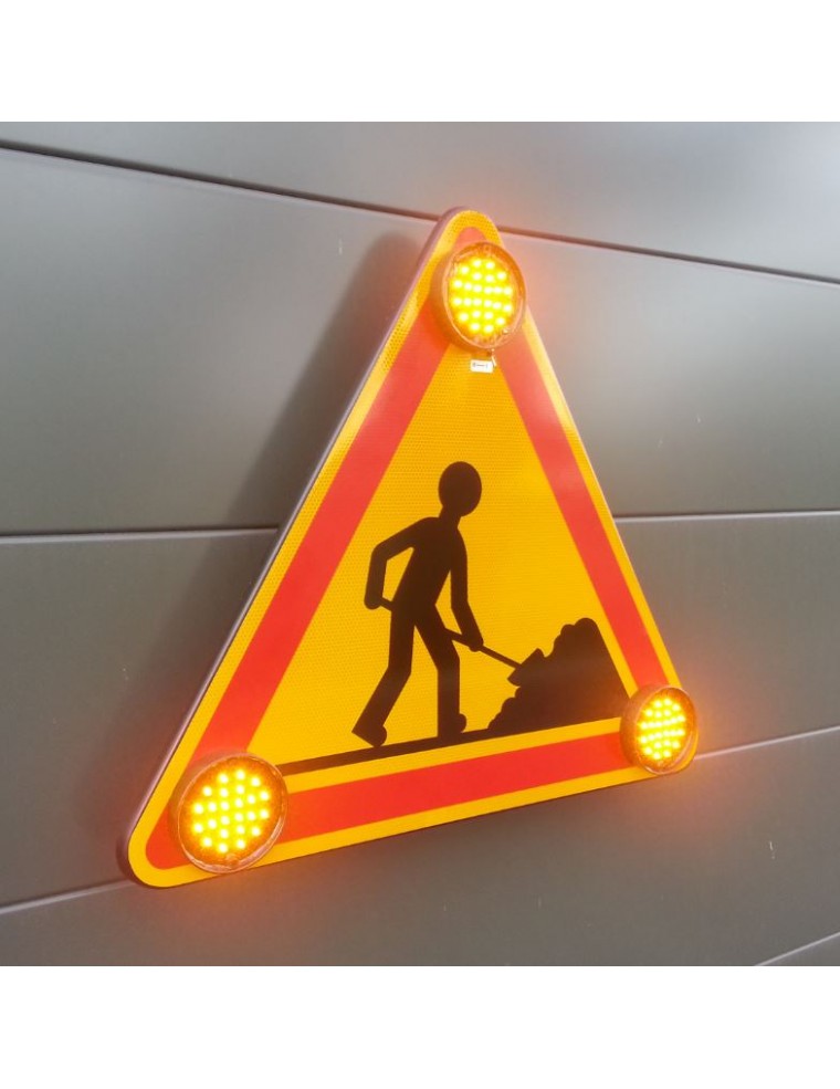 Ce panneau de signalisation existe sous différentes tailles : de 500 mm de hauteur, 700 mm de hauteur ou 1000 mm de hauteur. Il permet de signaler une zone de travail ou un lieu à risque et ainsi assurer la sécurité en avertissant autrui d’un possible danger. Ce panneau à LED lumineuses émet des signaux lumineux flashs et stroboscopiques afin d’alerter au mieux et complétant ainsi la signalisation du panneau pour les riverains ainsi que pour les automobilistes.